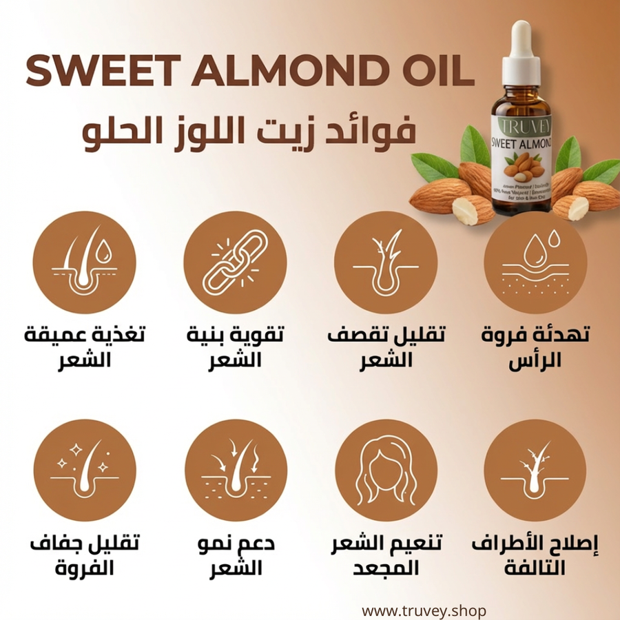 زيت حامل طبيعي وخفيف، معصور على البارد من أجود أنواع اللوز الحلو، معروف بخصائصه المرطبة والمغذية التي تجعله مثاليًا للعناية اليومية بالشعر والبشرة.